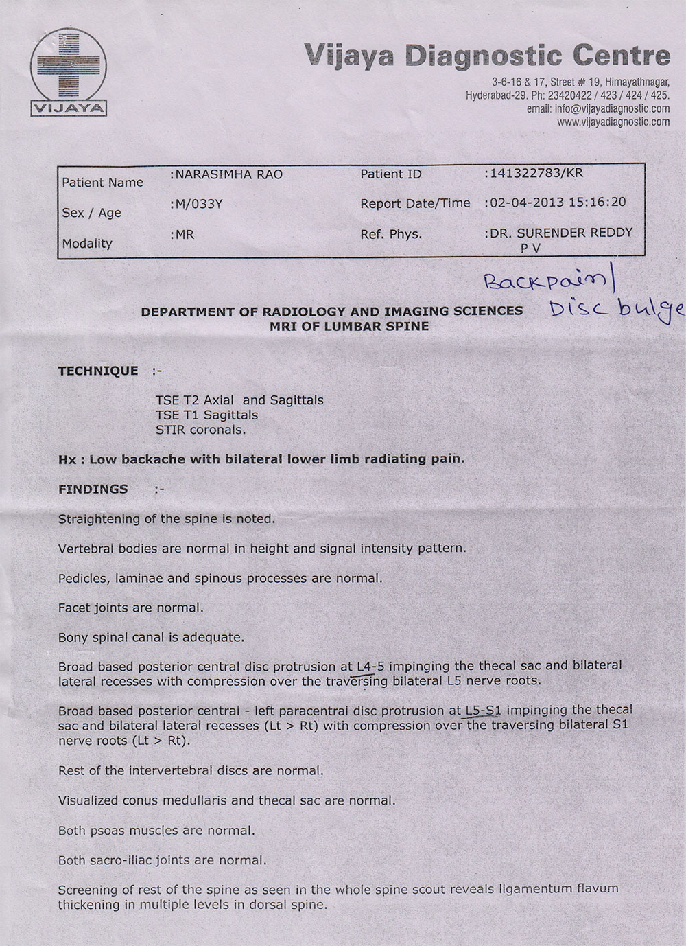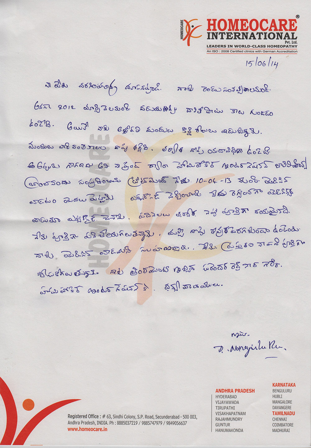 (Back Problem)“My name is Narasimha Rao D. For the past 2 yrs i.e., from march 2012 I was suffered with low backache and leg pain. I used allopathic therapies and other pain killers, they only shown temporary relief and pains returned if i will stop using those therapies. I consulted Homeocare International with advice of my friend Mr. Nagaraju and started treatment on 10 – 4 – 13. After 10 months of treatment along with exercises as suggested by doctor my pains are controlled and im able to do all my work with out pain. Now im using therapies to prevent recurrence of pains. I thank the doctors and Homeocare International for treating me. ” ***