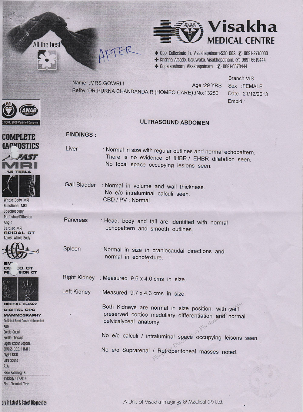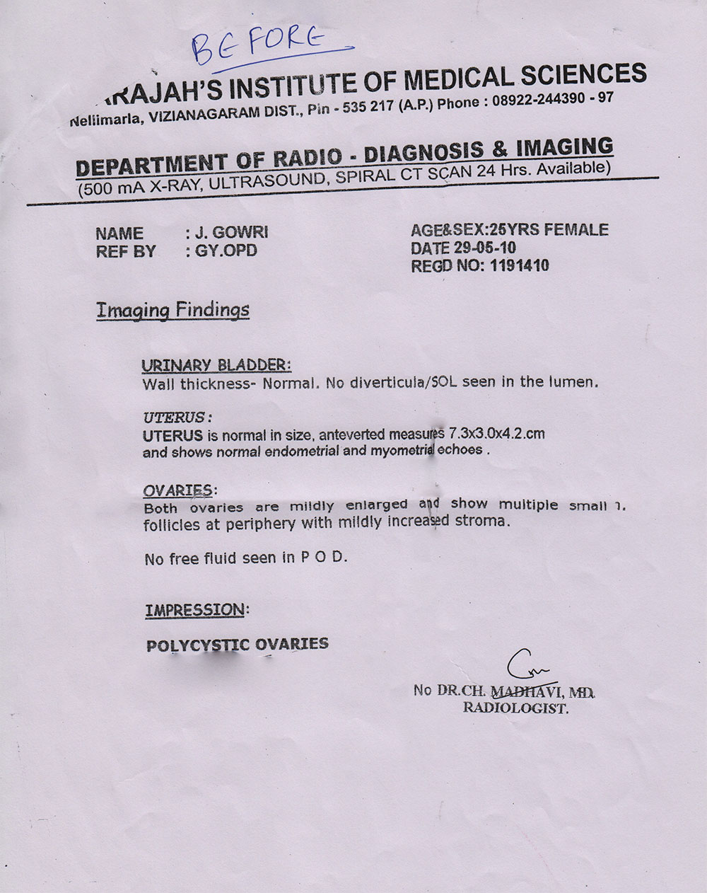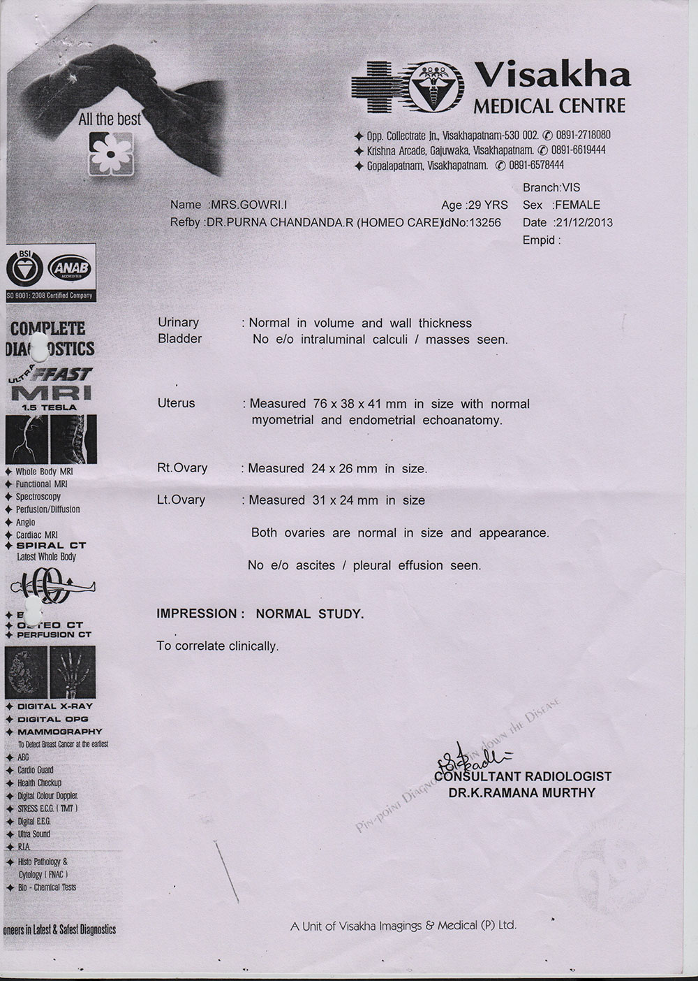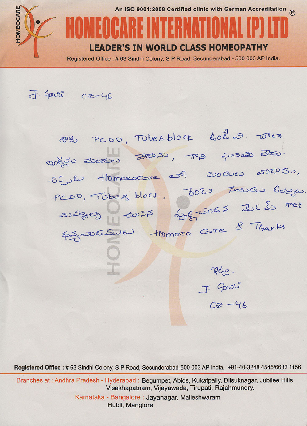 (PCOD)“I used lot of therapies and various treatments for PCOD and tubal block for a very long time without any improvement in my condition. As a final try I visited Homeocare International, Doctors after studying my report, symptoms and they started constitutional homeopathy treatment, now both my problems are solved. I thank Homeocare International and the Doctors, staff for helping me out.”***